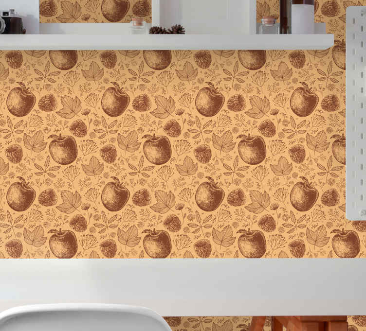 Referentienummer: P7027Een botanisch ontwerp met een herhalend patroon van appels en bladeren, wat wijst op een herfstthema. Het motief vangt de essentie van de natuur met zijn gedetailleerde afbeelding van bladeren.