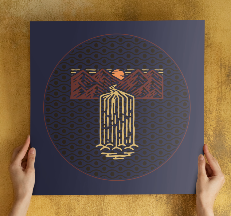 Referentienummer: Q7828Een rustgevende compositie met een waterval die naar beneden stroomt tussen gestileerde bergpieken en een ondergang van de zon. Het ronde ontwerp voegt harmonie toe, terwijl de ingewikkelde lijnen een gevoel van rust en verbinding met de natuurlijke wereld oproepen.