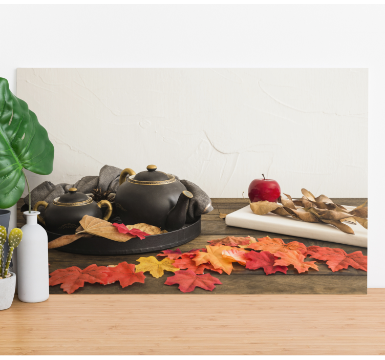 Het Herfst thee arrangement Landschap schilderij op canvas is een prachtige toevoeging aan elk interieur! Met zijn afbeelding van theepotten, borden, bladeren, en appels brengt het een vleugje rustieke herfstpracht in elke kamer.