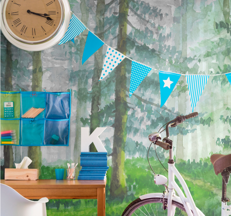 Voel de rust en de schoonheid van de natuur in uw eigen huis met ons Behang bos pad in het bos detail. Dit prachtige ontwerp combineert een schilderachtige illustratie van een serene woudomgeving met weelderige bomen die majestueus langs een vredig pad staan. De natuurlijke kleuren en de levendige groentinten brengen een frisse uitstraling in uw interieur, waardoor het lijkt alsof u elke dag in de natuur bent.