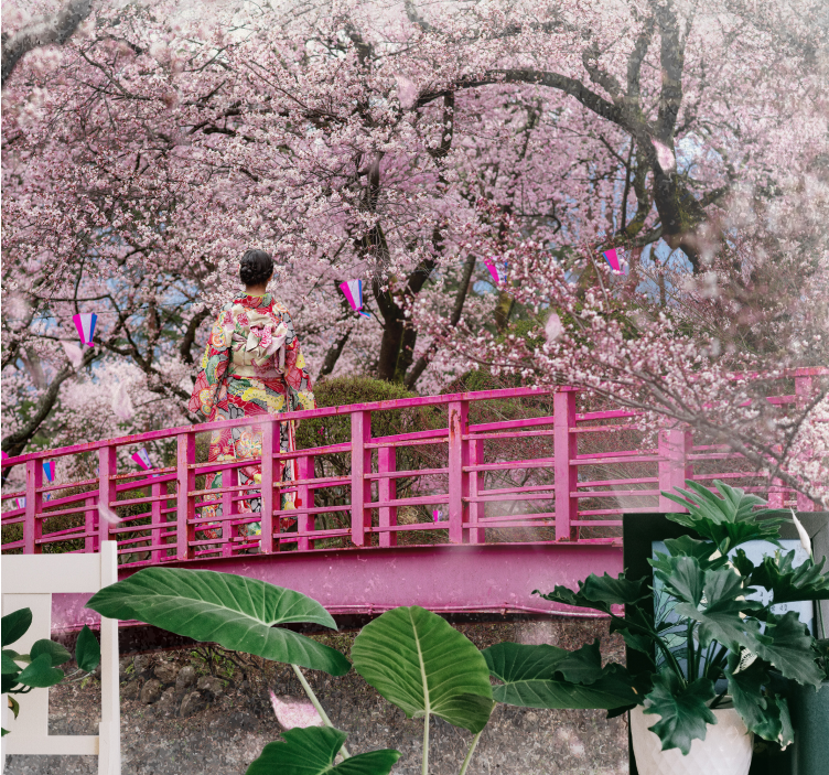 Referentienummer: F12031Een serene weergave van kersenbloesems in volle bloei, die een traditionele figuur op een roze brug omlijst. De delicate roze bloemen creëren een rustige sfeer, versterkt door de kleurrijke versieringen eromheen, en belichamen de schoonheid van de natuur en cultuur.