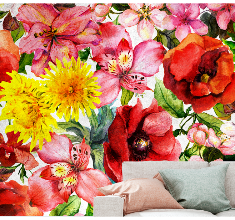 Breng de natuur in huis met ons prachtige fotobehang bloemen levendige bloem compositie. Dit ontwerp is een feest voor het oog, met een harmonieuze mix van klaprozen, madeliefjes, rozen en wilde bloemen die samenkomen in een adembenemende waterverf stijl. De levendige kleuren en bloemrijke compositie creëren een serene en vrolijke sfeer, perfect voor elke ruimte.