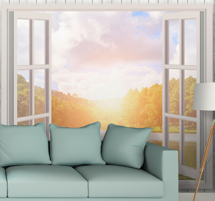 Referentienummer: F12132Een rustige scène die een zonsopgang boven een serene meer afbeeldt, ingekaderd door een open raam. Weelderig groen omzoomt de oevers, met prachtige bomen die in het water reflecteren. Het zachte licht creëert een vredige sfeer, die uitnodigt tot kalmte en ontspanning.