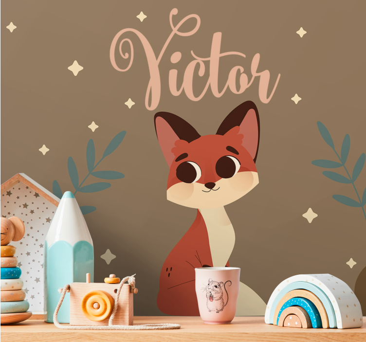 Referentienummer: F9831Een charmante vos met grote ogen en een speelse houding, omringd door delicate bladeren en sterren. Het ontwerp bevat de naam 'Victor', wat een persoonlijk tintje geeft aan dit heerlijke motief, perfect voor kinderkamers of speelse ruimtes.