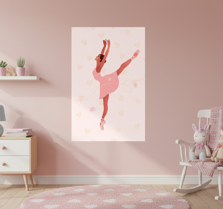 Referentienummer: G916Breng een vleugje magie naar de kinderkamer met onze Poster kinderkamer ballerina met harten. Dit prachtige ontwerp toont een elegante ballerina omringd door schattige harten, perfect voor het creëren van een droomachtige sfeer. Met een 180g/m2 grammage en een halfmatte finish, zorgt deze poster voor een levendige uitstraling zonder reflecties. De hoge kleurintensiteit maakt het een opvallend decoratiestuk dat elke ruimte verlevendigt!
