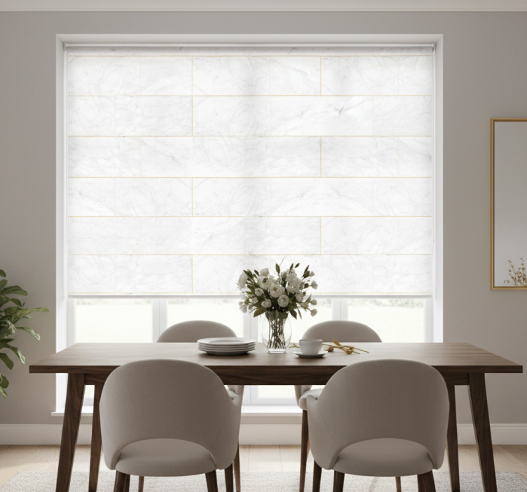 Eetkamer rolgordijn grijze tinten goud marmer