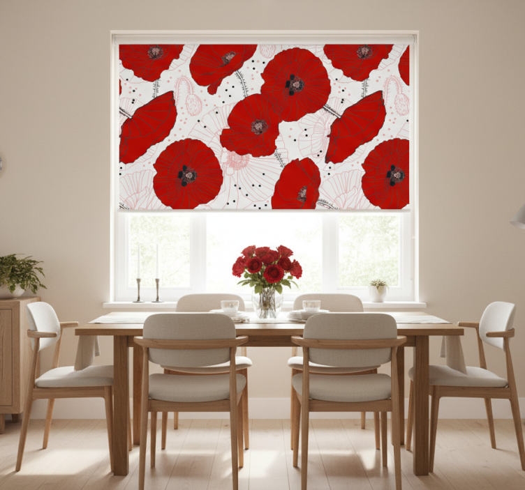 Eetkamer rolgordijn met tekeningen en rode bloemen