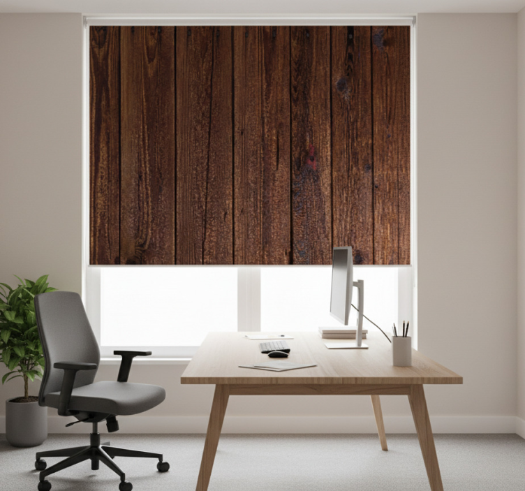 Kantoor rolgordijn donkerbruin rustiek houten planken