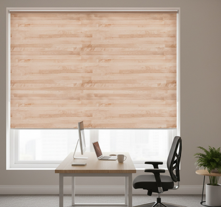 Kantoor rolgordijn elegante bruine houten plank