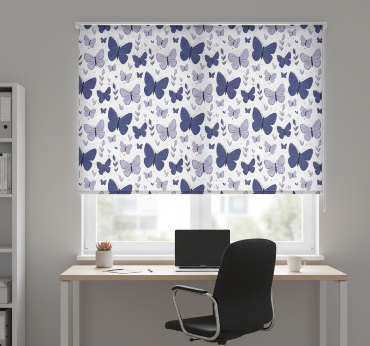 Delicate vlinders in tinten van paars en marineblauw dansen over een lichte achtergrond en creëren een betoverend patroon. Het ontwerp wordt aangevuld met kleine bladeren en subtiele accenten, die de gratie van deze wezens tonen. Ideaal voor degenen die de schoonheid van de natuur en levendige esthetiek waarderen. Kantoor rolgordijn vlinderpatroon in roze en blauw transformeert uw werkruimte met zijn sprankelende en speelse ontwerp. Het vlinderpatroon, dat in betoverende tinten roze en blauw is uitgevoerd, voegt een vleugje vrolijkheid toe aan elke kantooromgeving. Dit rolgordijn is niet alleen een visueel hoogtepunt, maar biedt ook praktische voordelen zoals bescherming tegen direct zonlicht, privacy wanneer het omlaag is, en helpt de kamertemperatuur te reguleren. Bovendien is het gemakkelijk schoon te maken en te demonteren, waardoor u uw raam en omgeving snel kunt onderhouden. Dit rolgordijn is de ideale keuze voor iedereen die functionaliteit en stijl wil combineren.