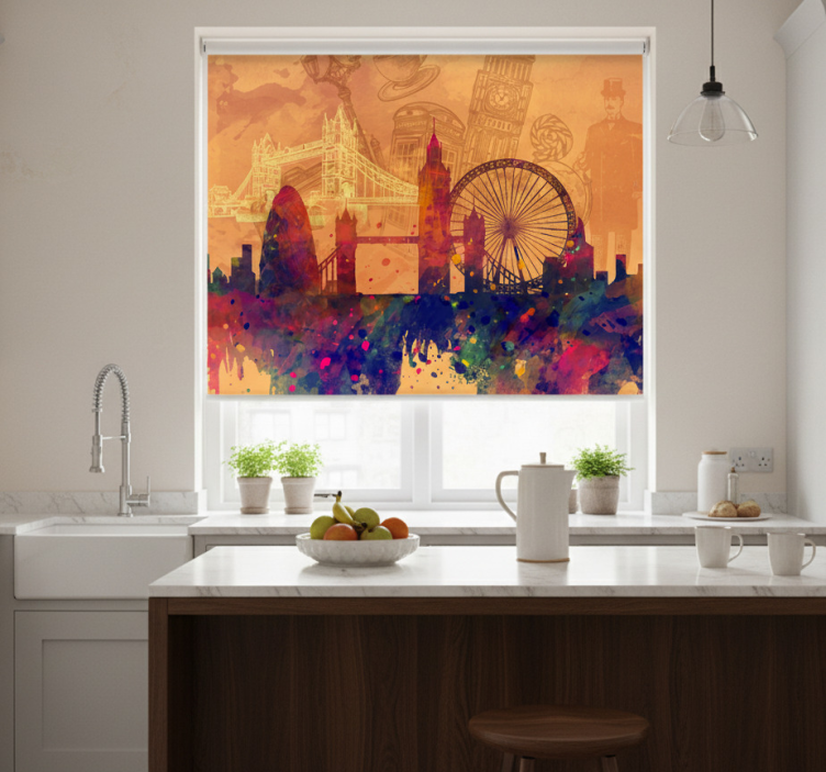 Een Keuken rolgordijn historische skyline silhouet keuken rolgordijn is niet alleen een praktische oplossing voor privacy en lichtregulatie, maar ook een prachtige decoratieve toevoeging aan uw keuken. Het silhouet zorgt voor een artistieke uitstraling, terwijl het tegelijkertijd de zonnestralen filtert. Dit rolgordijn verbetert de algehele sfeer van de ruimte, waardoor het een gezellige en uitnodigende plek wordt om te koken en te genieten van maaltijden met vrienden en familie. Laat uw keuken stralen met deze stijlvolle decoratie!