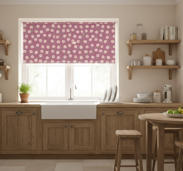 Keuken rolgordijn met een patroon van kleine roze madeliefjes