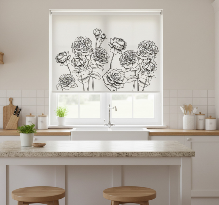 Keuken rolgordijn met zwart-witte handgetekende rozen