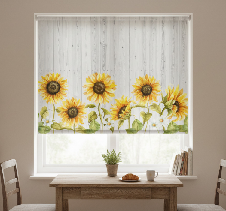 Keuken rolgordijn zonnebloemen op grijze planken