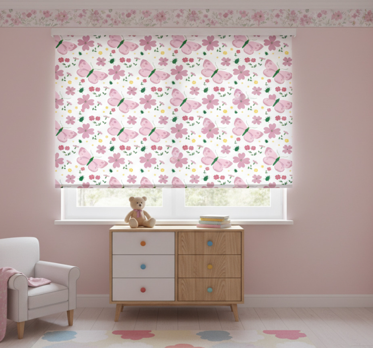 Kinderkamer rolgordijn met delicate roze bloemen en vlinders
