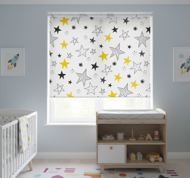 Transformeer de kinderkamer met ons Kinderkamer rolgordijn rock-'n-roll sterren! Dit prachtige rolgordijn heeft een levendig ontwerp vol sterren en een rock-'n-roll thema dat de fantasie van elk kind zal prikkelen. De sterren stralen in een combinatie van vrolijke kleuren die perfect passen in een speelse, creatieve omgeving. Dit rolgordijn is niet alleen een praktische oplossing voor zonlicht en privacy, maar ook een stijlvol element dat de decoratie van de kamer verbetert!
