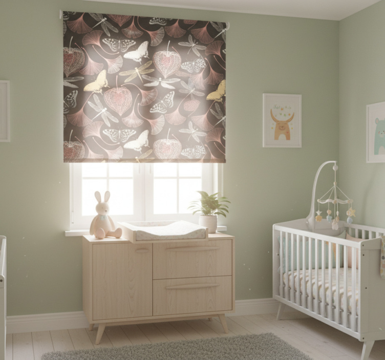 Kinderkamer rolgordijn roze bladeren zwarte vlinder patroon