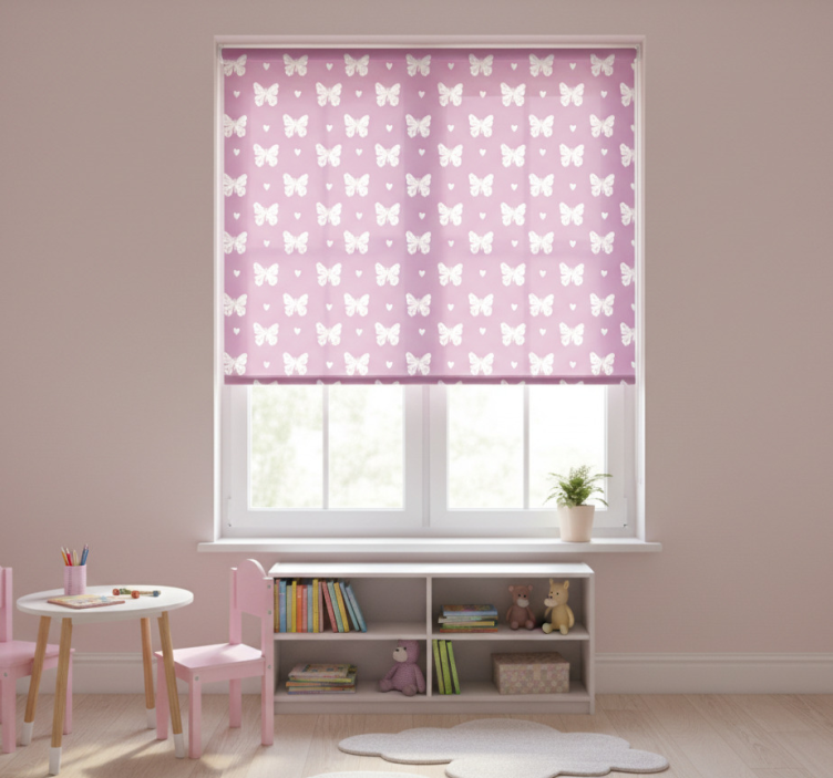 Kinderkamer rolgordijn roze vliegende vlinderspatroon