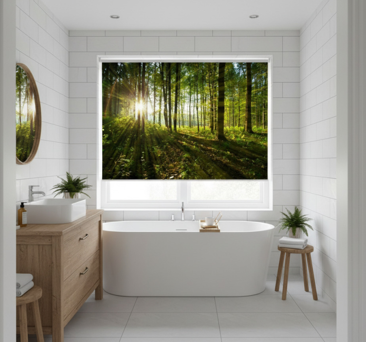 Referentienummer: E6124Rolgordijn bomen gouden zonnestraal hout