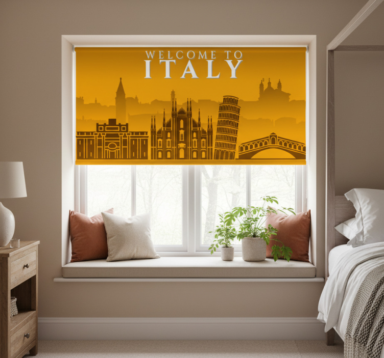 Breng de zon en de levendigheid van de Italiaanse skyline in uw huis met ons rolgordijn geel skyline italië. Dit prachtige ontwerp combineert een stralende gele kleur met een grafisch uitzicht op de iconische skyline van Italië, waardoor elke ruimte een sprankelende en vrolijke uitstraling krijgt. Het rolgordijn is niet alleen een visueel hoogtepunt, maar biedt ook praktische voordelen, zoals privacy en zonwering, waardoor het een perfecte aanvulling is voor uw interieur!