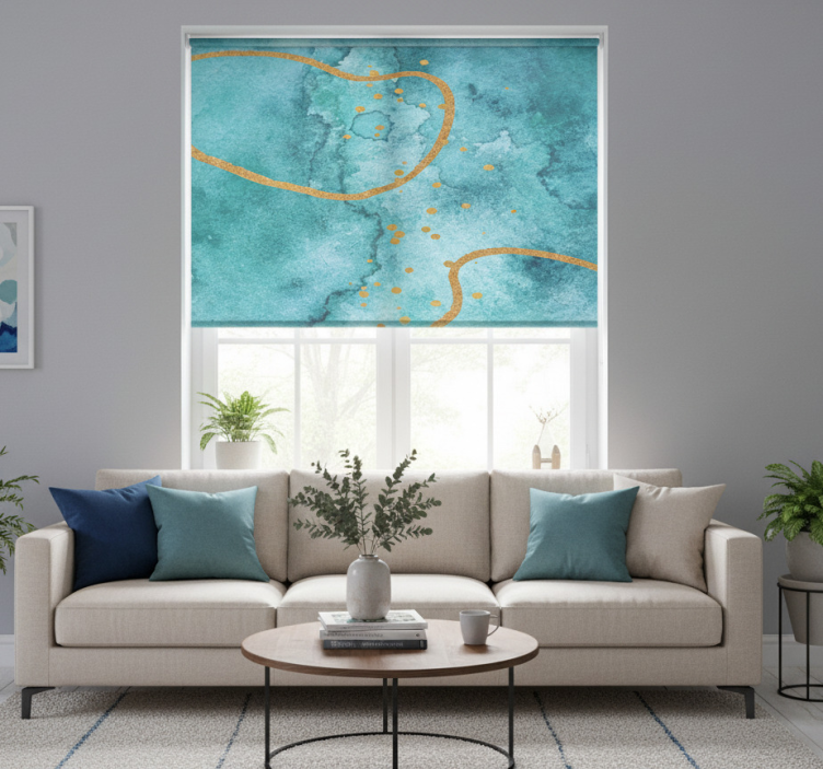 Een rolgordijn woonkamer abstract aquamarijn met goud rolgordijn woonkamer is de ideale decoratieve oplossing voor uw huis. Het biedt niet alleen privacy en bescherming tegen direct zonlicht, maar voegt ook een vleugje stijl toe aan uw woonkamer. Met zijn unieke kleuren en patronen transformeert dit rolgordijn uw ruimte in een oase van rust en schoonheid. Laat uw creativiteit de vrije loop en maak van uw woonkamer een stijlvolle en uitnodigende plek!