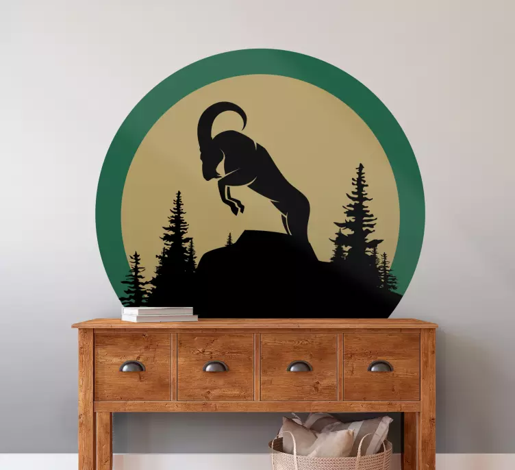Referentienummer: A48507Een opvallende silhouet van een berggeit gevangen in een sprongetje, omringd door torenhoge bomen tegen een zachtgekleurde cirkelachtergrond. Dit ontwerp roept een gevoel van avontuur en de essentie van de natuur op, perfect voor degenen die geïnspireerd zijn door de natuur en het buitenleven.