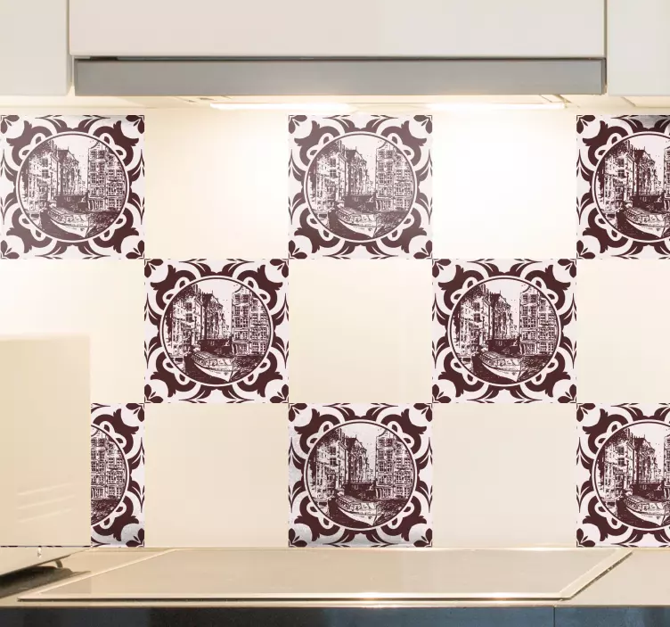 Maak uw ruimte uniek met onze Decoratie sticker locaties historisch kanaalzicht. Dit prachtige ontwerp toont een betoverend stadsgezicht met elegante huizen, een sfeervol kanaal, en een stijlvol patroon dat de architectuur van de Europese steden vastlegt. De combinatie van tegels en decoratieve elementen maakt het een perfect accent voor elke kamer in uw huis.