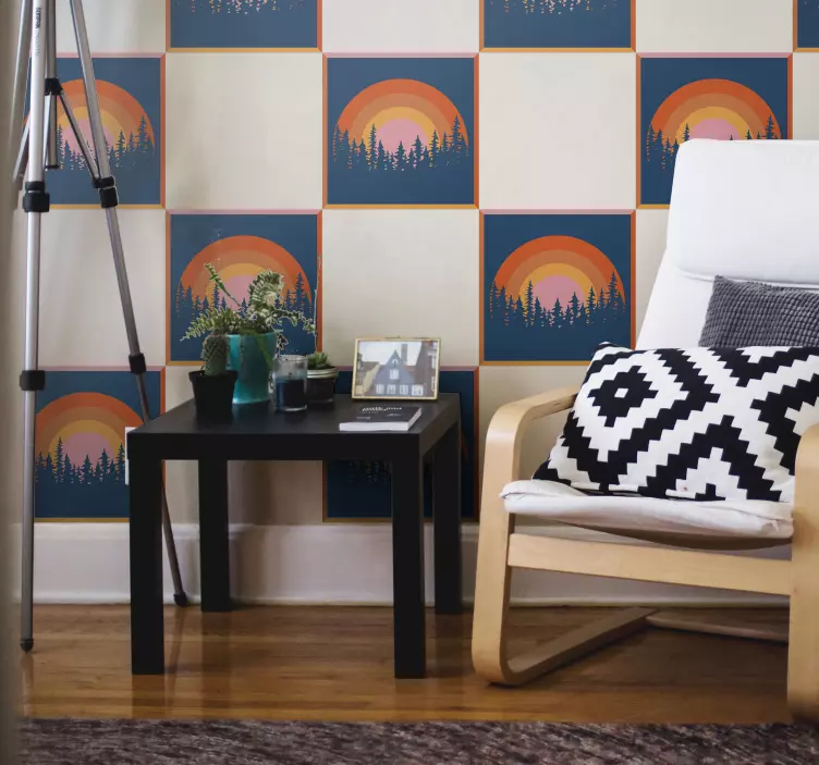 Ontdek onze prachtige decoratie sticker locaties zonsondergang bos scene, een adembenemend ontwerp dat de serene schoonheid van de natuur vastlegt. Met een stralende zon die ondergaat achter een weelderig woud, en een levendig kleurenpalet dat de magie van het landschap weerspiegelt, brengt deze sticker een vleugje rust en harmonie in uw interieur. De combinatie van de zon, de natuur en de tegels creëert een rustgevende sfeer die elke ruimte transformeert!
