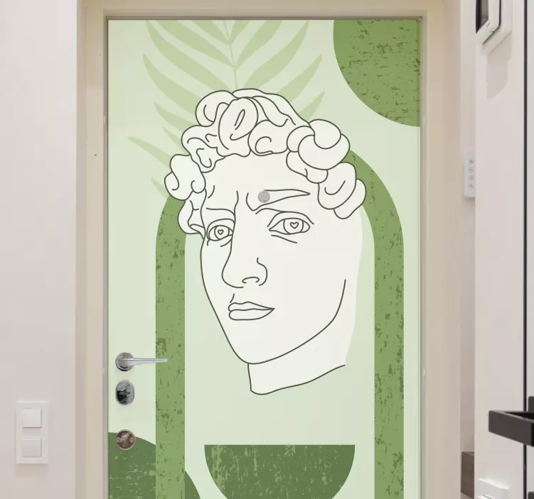 Ontdek onze prachtige deursticker hedendaagse gezichtsillustratie, een meesterwerk dat het grafisch ontwerp naar een hoger niveau tilt! Deze sticker is geïnspireerd door het iconische David standbeeld en brengt een minimalistische en moderne uitstraling in groene tinten. Met abstracte vormen en lijnkunst is deze deursticker perfect voor elke deur die een frisse en artistieke touch nodig heeft.