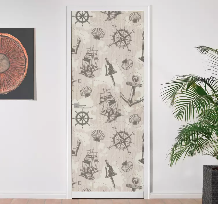 Breng een vleugje avontuur in je huis met onze Deursticker nautisch avontuur thema! Dit prachtige grafische ontwerp is geïnspireerd op de zee en omvat een scala aan nautische elementen zoals ankers, hout, planken, en een patroon dat je meteen naar het zeilen brengt. Met kompassen, schelpen, vuurtorens, en schepen in een sfeervolle illustratie is deze sticker perfect voor iedereen die van de strand en marine houdt!