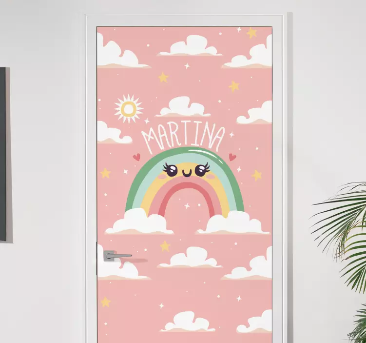 Breng kleur en vreugde in je interieur met onze deursticker op maat regenboogontwerp. Dit schattige ontwerp met wolken en een stralende zon maakt elke deur een feestje! Gepersonaliseerd met jouw naam is deze sticker de perfecte manier om een glimlach op ieders gezicht te toveren. Geniet van het plezier dat deze unieke sticker met zich meebrengt!