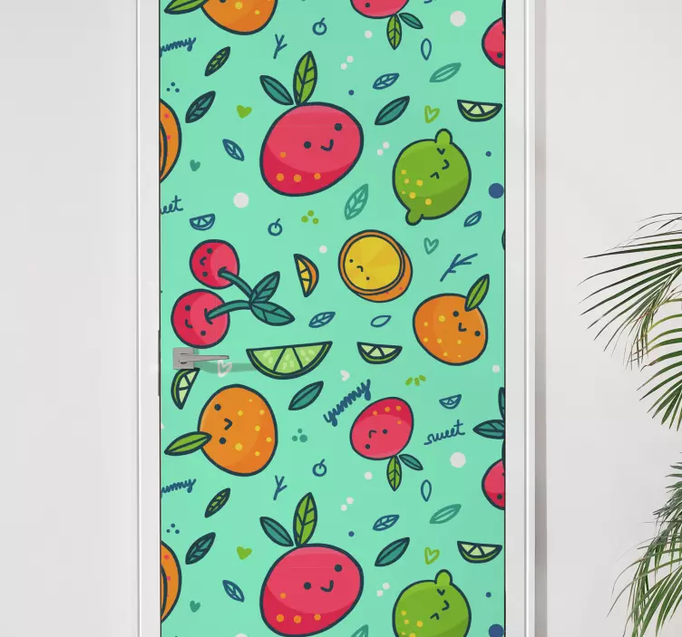 Breng kleur en speelsheid in je interieur met onze Deursticker speelse fruitpatronen. Dit unieke grafische ontwerp bevat vrolijke tekeningen van fruit in een schattige illustratiestijl, perfect voor elke deur. De levendige kleuren en de speelse uitstraling maken het een geweldige toevoeging aan je huis. Laat de natuur binnenkomen en geef je ruimte een frisse, vrolijke look!