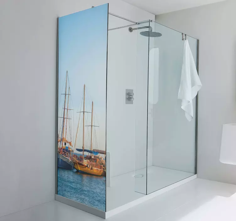 Breng de magie van de zee naar uw badkamer met onze Douchedeur sticker zeilboten scène. Dit prachtige ontwerp laat een serene haven zien waar zeilboten elegant op het water drijven. De combinatie van boten, dokken en de glinsterende reflecties op het water creëert een visueel spektakel dat elke douche-ervaring transformeert in een nautisch avontuur. Laat de maritieme sfeer uw badkamer opvrolijken en geniet van het gevoel dat u zich buiten bevindt, omringd door de schoonheid van de natuur.