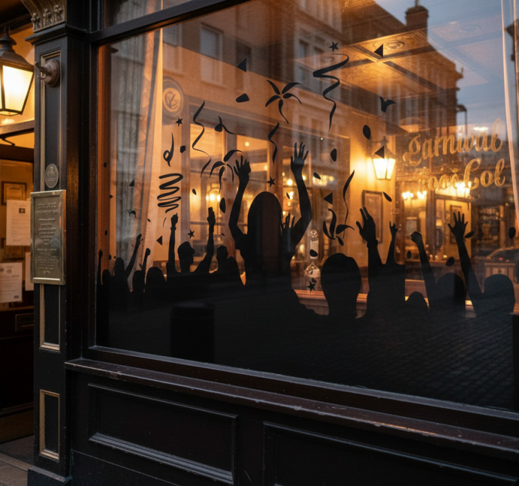 Referentienummer: A53880Breng de feestelijke sfeer van carnaval naar uw etalage met onze etalage sticker feestende carnavalsmenigte. Deze unieke sticker heeft een prachtig ontwerp dat een levendige menigte in volle feeststemming weergeeft. De satijnen afwerking zorgt ervoor dat u kunt genieten van de intense kleuren zonder hinderlijke reflecties, waardoor uw etalage altijd in het oog springt. Het is een product van topkwaliteit dat eenvoudig te installeren is en perfect geschikt voor elk vlak oppervlak!