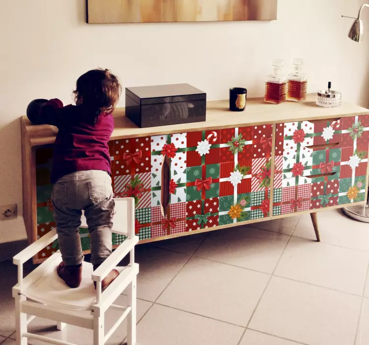 Breng de magie van de feestdagen tot leven met onze prachtige Feestdagen sticker voor feestelijke cadeauverpakking. Dit ontwerp, met een vrolijk patroon in rood en groen, straalt de geest van Kerstmis uit. De decoratieve strikken en vierkante vormen voegen een speelse touch toe aan elke geschenkverpakking, waardoor uw cadeaus nog specialer worden. Deze sticker is perfect voor het creëren van een feestelijke sfeer, of het nu om meubels of geschenken gaat.