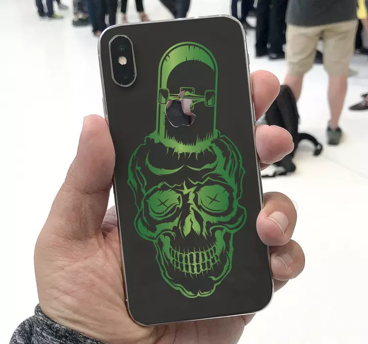 Maak kennis met onze Iphone sticker groen skull design, een opvallend ontwerp dat perfect is voor de creatieve geest! Deze sticker combineert een edgy schedel met een telefoon en een skateboard, waardoor het een uniek karakter uitstraalt. De groene tinten brengen een frisse vibe die je iPhone echt laat opvallen!
