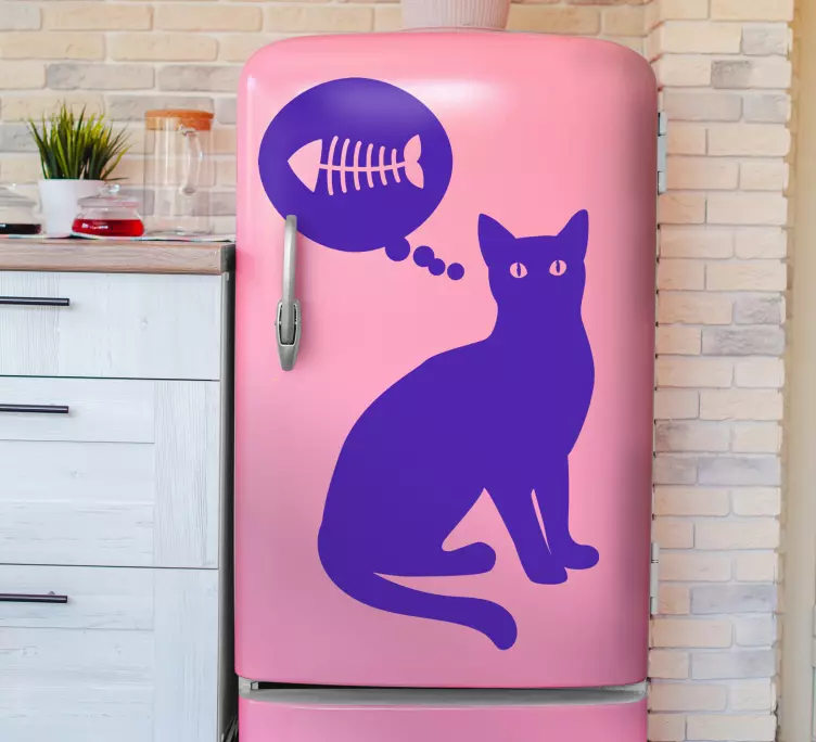 Laat je keuken sprankelen met onze Koelkast sticker denkende kat silhouet, een uniek ontwerp dat de speelse geest van een denkende kat vastlegt in een silhouet. Deze grappige sticker, compleet met een gedachtenbubbel en een vis, geeft een vrolijke touch aan je koelkast en is perfect voor elke kattenliefhebber! Het visgraatpatroon maakt het ontwerp nog interessanter, waardoor het een echte blikvanger in je keuken is.