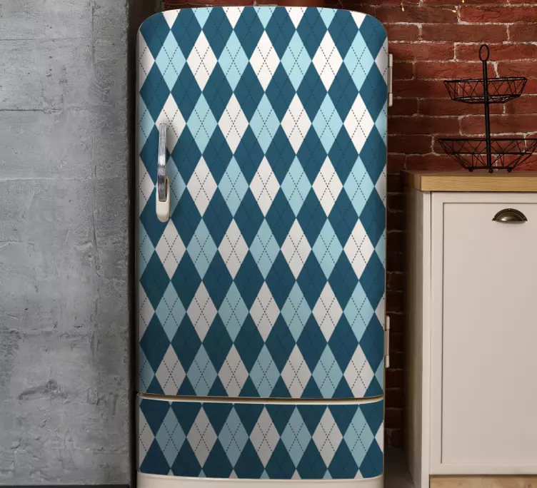 Deze Koelkast sticker diamantpatroon wrap voegt een prachtige grafische uitstraling toe aan uw keuken met zijn ruiten en diamanten in een blauw geometrisch patroon. Het elegante en moderne ontwerp brengt niet alleen stijl, maar ook een frisse sfeer in uw ruimte!
