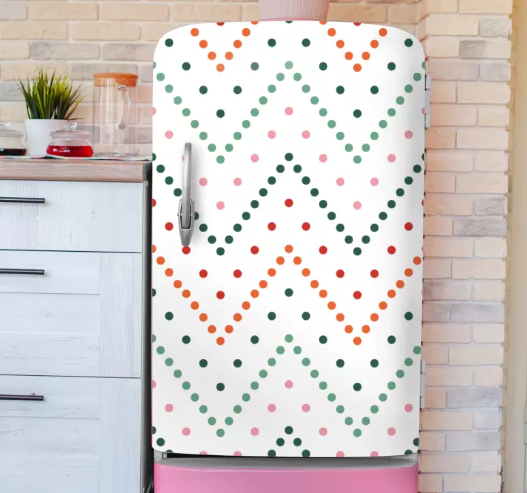 Breng een vrolijke sfeer in uw keuken met onze Koelkast sticker vrolijk chevron motief. Dit prachtige ontwerp bevat een speelse combinatie van zigzag en polka stippen, allemaal in een kleurrijke en moderne stijl die perfect aansluit bij elk interieur. De combinatie van levendige kleuren en unieke patronen maakt deze sticker tot een echte blikvanger voor uw koelkast.