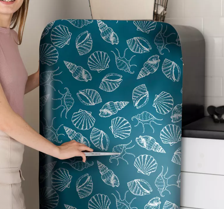 Breng de schoonheid van de oceaan naar uw keuken met onze Koelkast sticker zeeschelpen botanisch patroon. Dit prachtige ontwerp bevat een verscheidenheid aan schelpen en bladeren die samen een adembenemend maritiem patroon vormen. Het is een perfecte manier om uw koelkast te transformeren in een kunstwerk dat de natuur viert en uw ruimte verfrist!