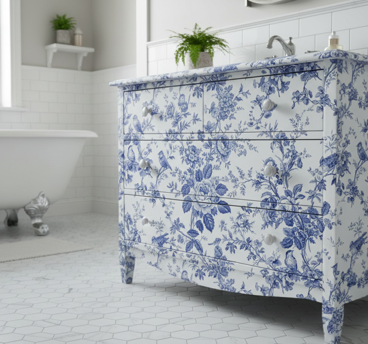 Meubel sticker blauwe toile bloemen zangvogels