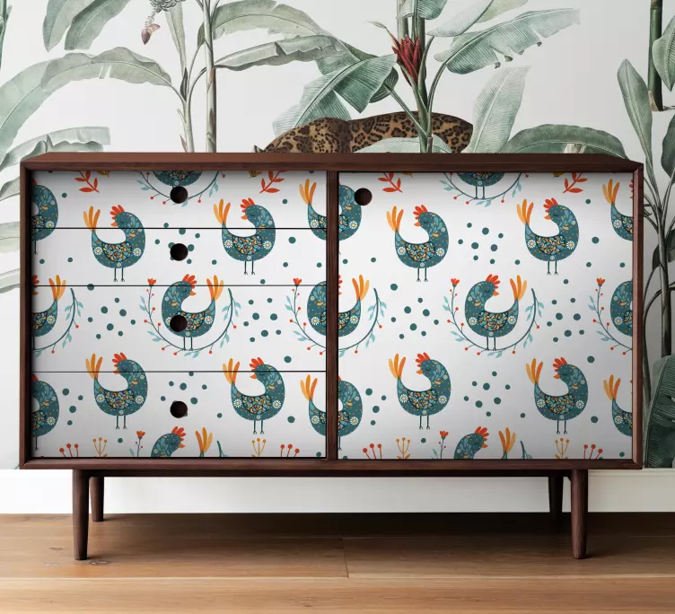 Breng een speelse en levendige sfeer in uw interieur met onze Meubel sticker levendige haan illustratie. Dit prachtige ontwerp is een kleurrijke mix van boerderijdieren, waaronder vrolijke kippen, en wordt omlijst door delicate bloemen. Het speelse patroon zorgt ervoor dat elk meubelstuk een unieke uitstraling krijgt en de levendige kleuren geven een frisse impuls aan uw inrichting. Deze illustratie is perfect voor liefhebbers van dieren en natuurlijke elementen en zal ongetwijfeld een glimlach op uw gezicht toveren!