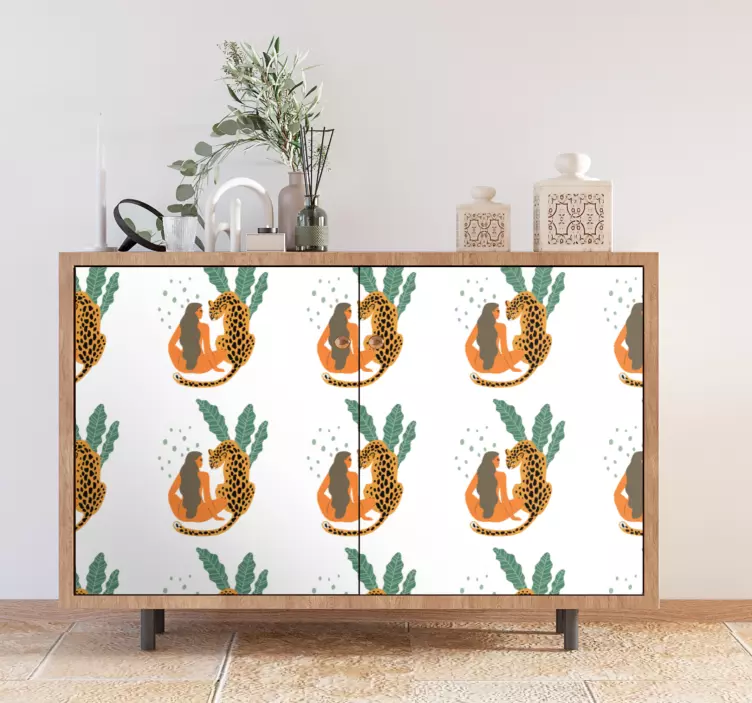 Laat je interieur stralen met de Meubel sticker luipaardplant scène, een prachtig handgetekend ontwerp dat de schoonheid van de natuur naar binnen brengt. Deze sticker, die een vrouw omringd door luipaarden en tropische planten toont, geeft een grillige, dierlijke charme aan elk meubelstuk. Het patroon is zorgvuldig samengesteld en biedt een levendige uitstraling die elke ruimte transformeert in een tropisch paradijs!