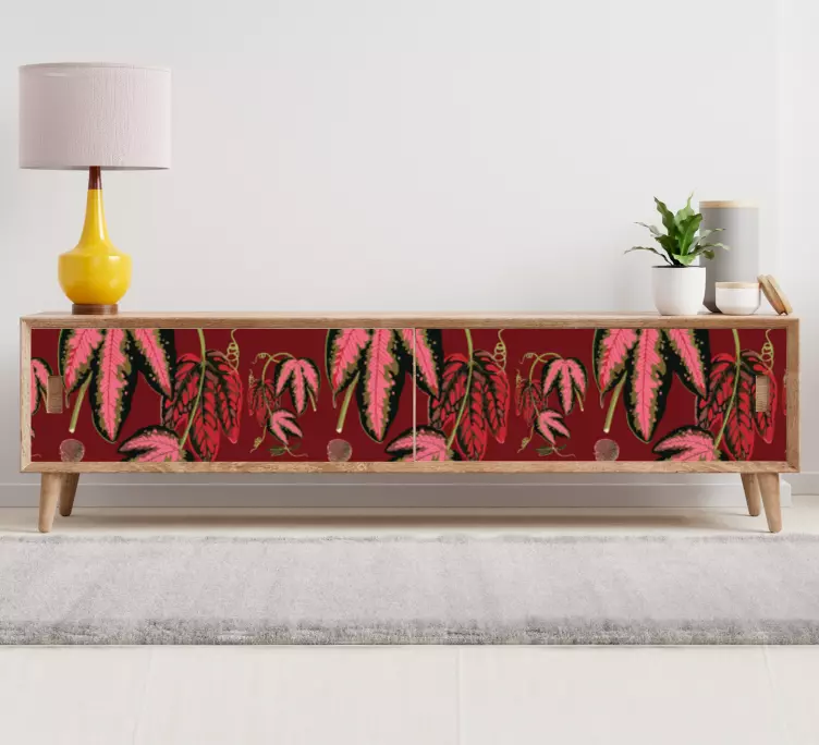 Breng de natuur in huis met onze Meubel sticker lush leaf motief. Dit prachtige ontwerp toont een levendig patroon van maranta bladeren met bloemen in tinten van rood, groen en roze. De illustratie straalt een natuurlijke flair uit en maakt elk meubelstuk tot een uniek meubelaccent. Laat de flora tot leven komen in uw interieur en geef uw meubels een frisse uitstraling!