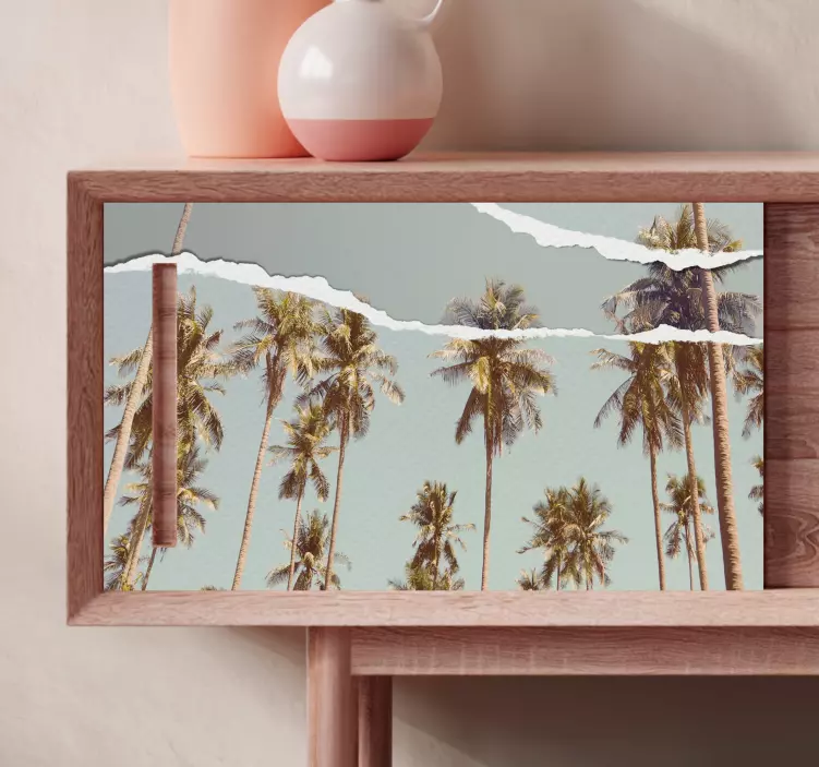 Breng de tropische sfeer in uw huis met onze Meubel sticker tropisch palm uitzicht. Dit prachtige ontwerp toont majestueuze palmboom en handpalmen tegen een serene achtergrond van gescheurd papier, waardoor het lijkt alsof je de natuur in je ruimte uitnodigt. De combinatie van palmbomen en een peacevolle uitstraling zorgt voor een rustgevende ambiance die perfect is voor elk interieur. Laat uw meubels transformeren in een tropisch paradijs en geniet van de natuurlijke schoonheid die deze sticker met zich meebrengt.