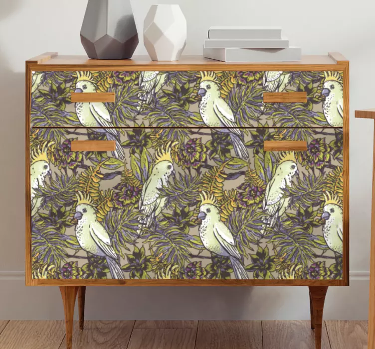 Breng kleur en leven in uw interieur met onze Meubel sticker vrolijke vogel geïnspireerd concept. Dit prachtige ontwerp bevat een levendige papegaai omringd door bladeren en bloemen, waardoor het een tropische sfeer uitstraalt. De combinatie van vogels en natuur geeft een frisse uitstraling aan elk meubilair en maakt het een perfecte aanvulling voor elke ruimte. Laat de flora en het kleurrijke patroon een sprankje vreugde in uw huis brengen!