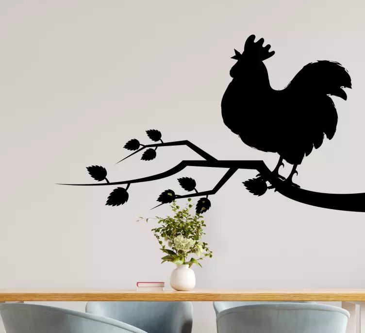 Referentienummer: A49034Een opvallende silhouet van een haan die op een tak zit, waarbij elementen van de natuur worden gecombineerd met het boerenleven. De tak versierd met bladeren voegt een organische toets toe, waardoor het rustieke gevoel van het ontwerp wordt versterkt, ideaal om een landelijke charme aan elke ruimte te geven.