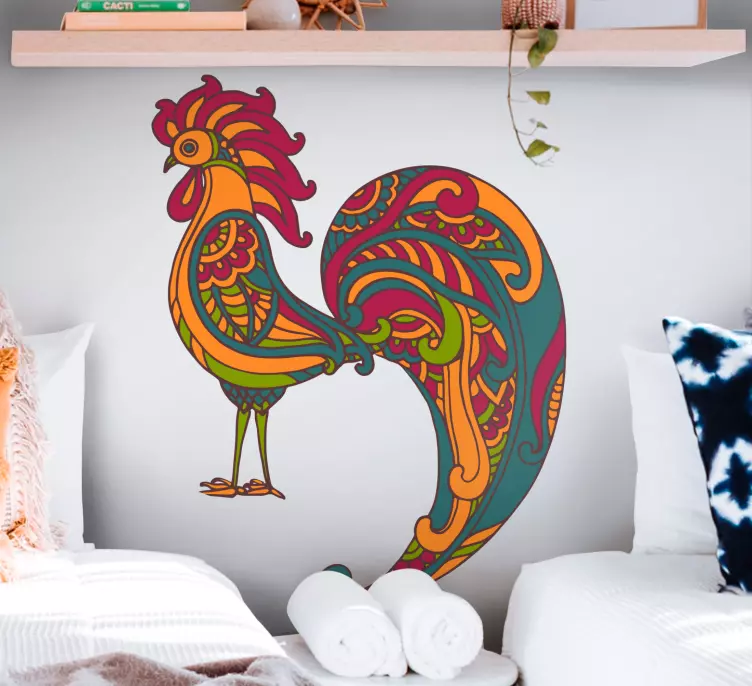 Breng het leven op de boerderij in uw huis met onze Muursticker boerderijdieren kleurige haan ontwerp. Dit prachtige ontwerp van een levendige haan in etnisch silhouet voegt een decoratieve en speelse touch toe aan elke ruimte. Het kleurige ontwerp is overladen met details en geeft een vrolijke uitstraling die perfect is voor een kinderkamer, speelruimte of zelfs in de keuken.