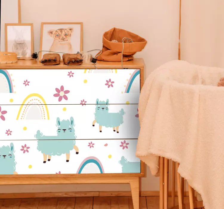 Referentienummer: A53492Een speelse ontwerp met vrolijke lama's te midden van levendige bloemen en speelse regenbogen. Dit levendige patroon voegt een vrolijke touch toe, perfect voor het creëren van een leuke sfeer. De combinatie van schattige personages en heldere kleuren maakt het ideaal voor kinderkamers of feestelijke vieringen.