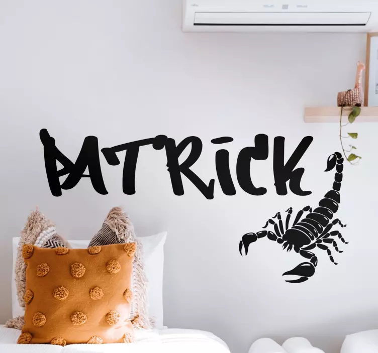 Referentienummer: A49594Een opvallend aanpasbaar ontwerp met een gedurfde schorpioen naast een opvallende naam. Dit ontwerp combineert zowel persoonlijkheid als symboliek, waardoor het een unieke uitstraling creëert in elke ruimte. Perfect voor wie een vleugje individualiteit aan zijn omgeving wil toevoegen.